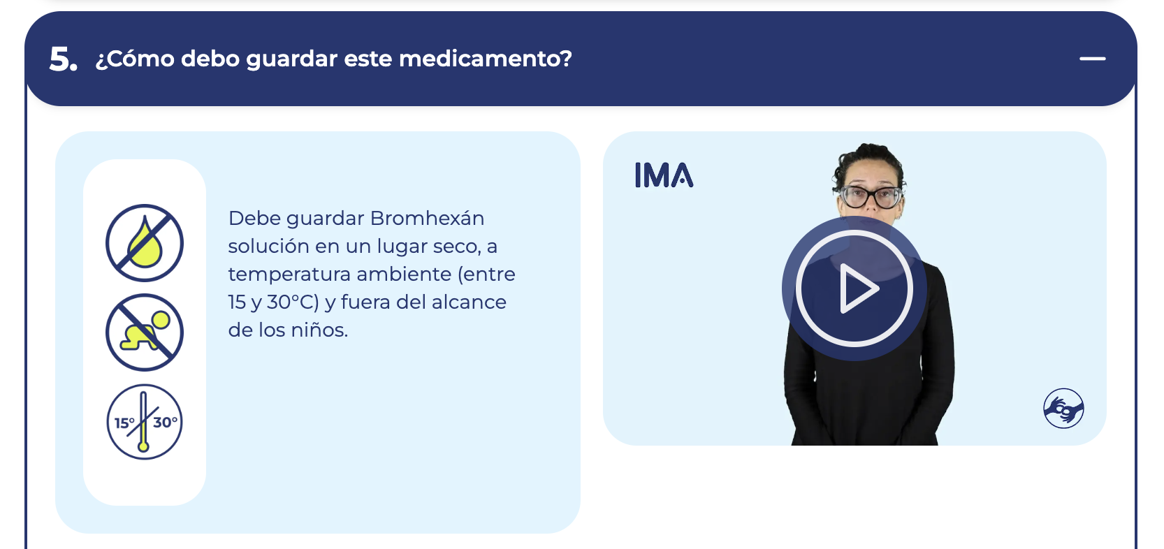 Cada IMA resume la información contenida en el prospecto del medicamento de los laboratorios Dorrego y D.N.S.FF.AA, incluyendo sus principales usos, efectos no buscados, precauciones y situaciones que contraindican su uso. También brinda recomendaciones sobre cómo usarlo adecuadamente y cómo desecharlo cuando ya no se utiliza más o está vencido.